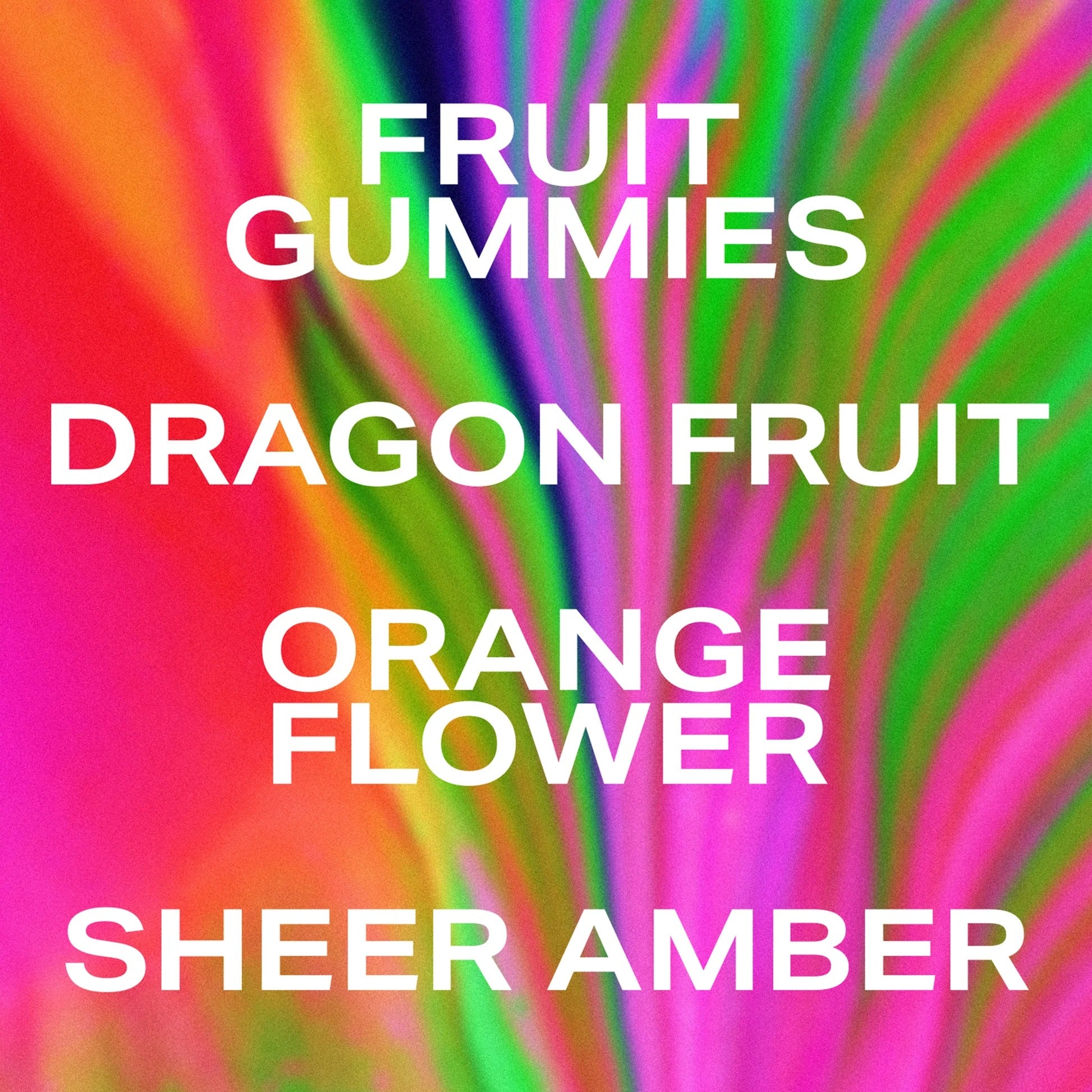 Take a euphoric sugar trip. A dynamic, vibrant mood enhancing fragrance that transports you to a technicolor daydream. This fruity floral fragrance starts with the nostalgic sweetness of fruit gummies bursting through bright orange zest and dragon fruit pulp, while sunny blooms of marigold and orange flower add a dreamy ambiance. C’mon get happy.